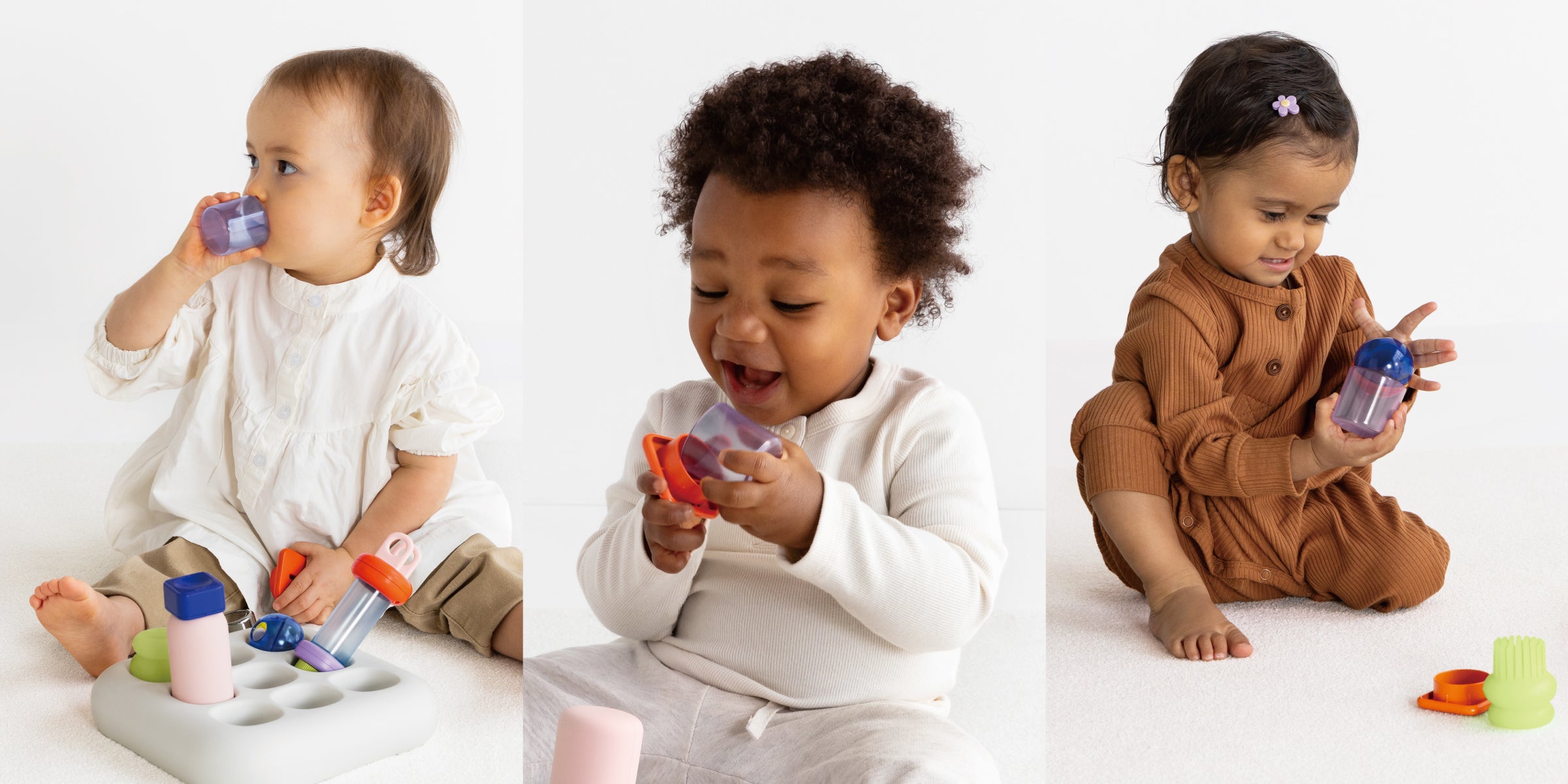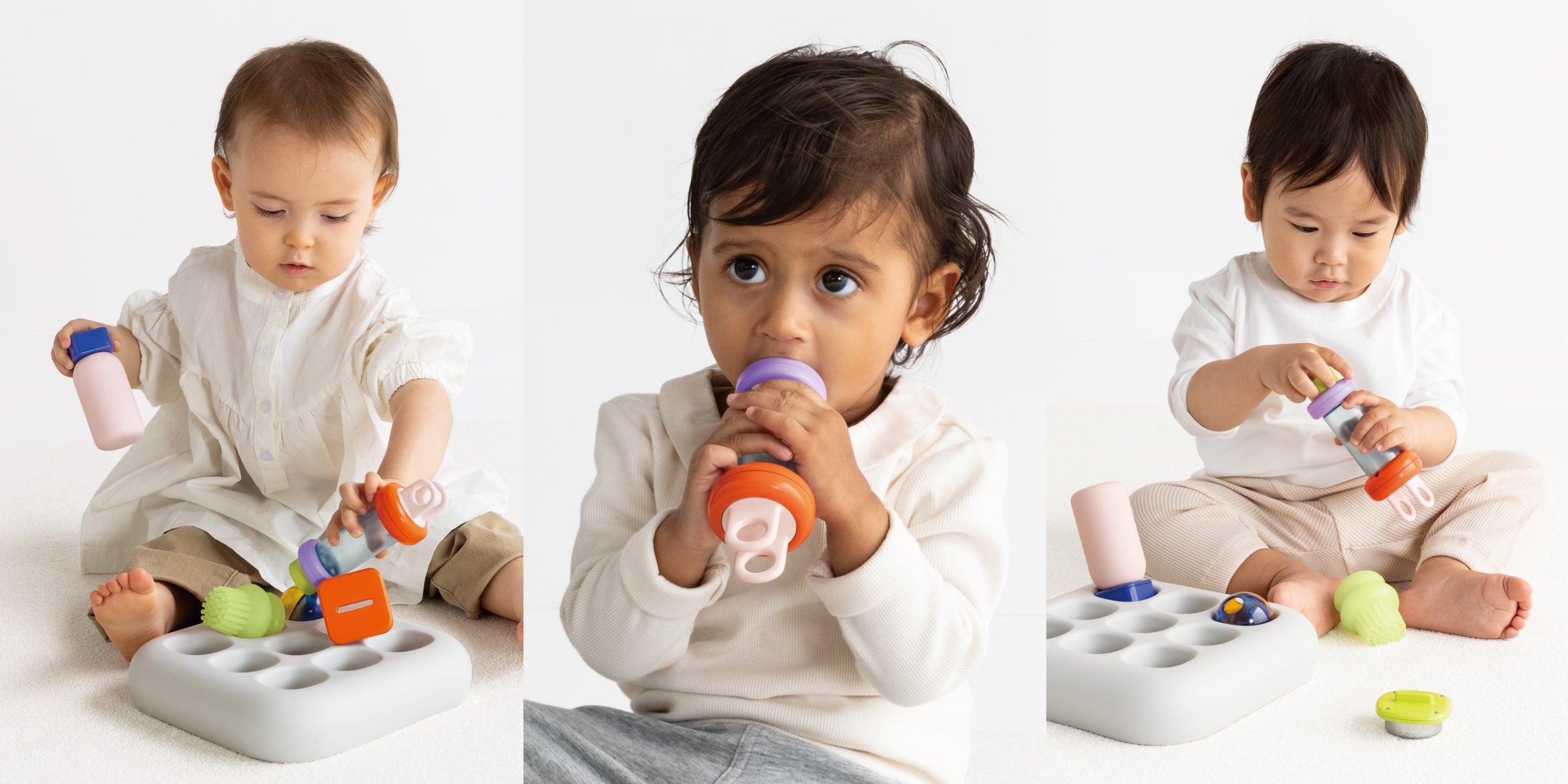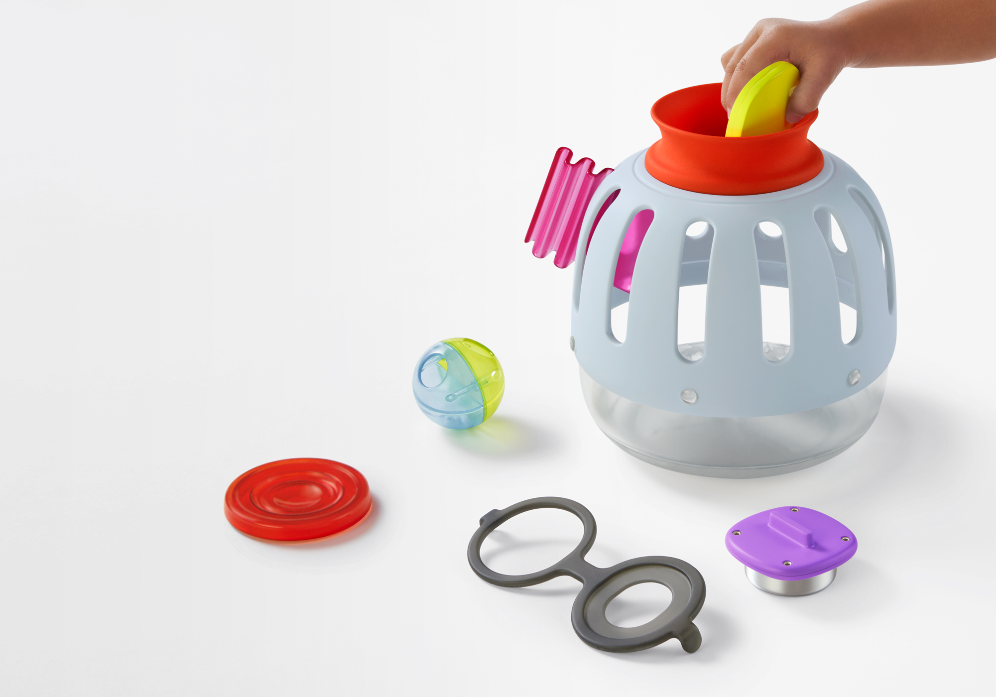 This led to a bottle design with soft, pinchable ends (kind of like a plug!) and fun ridges inspired by twist caps. With just this one toy, kids can hold, twist, poke their fingers in, and make fun sounds.