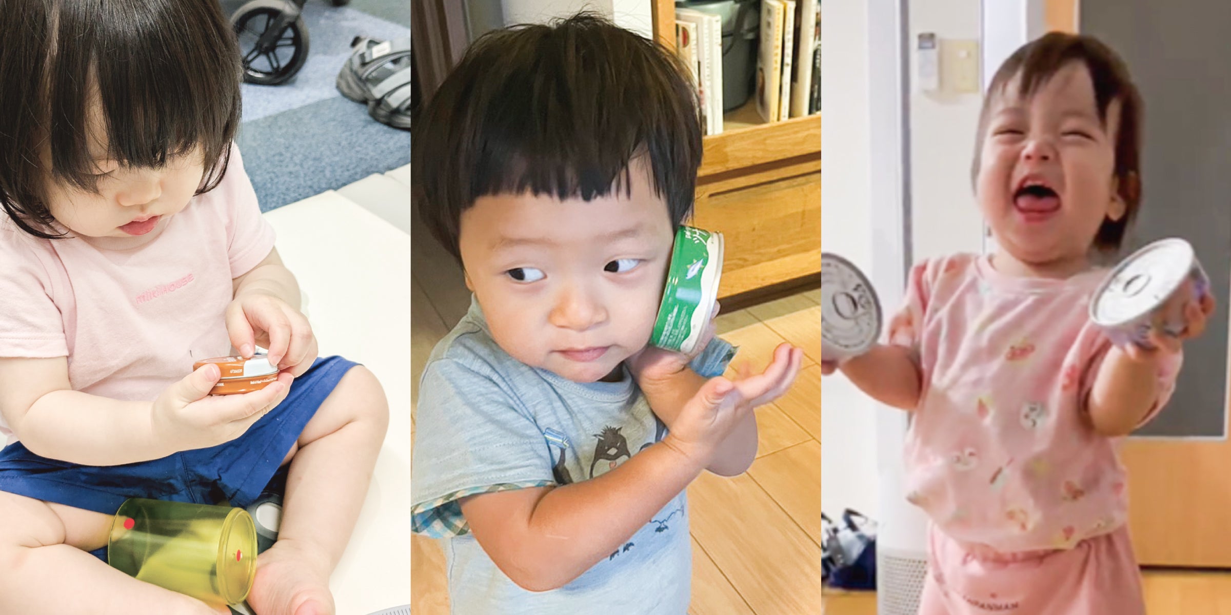 Metal cans have a magical appeal. They’re cool to the touch and feel wonderfully smooth. This toy is inspired by how little ones around 1 year old love items like lotion that come in metal containers.
