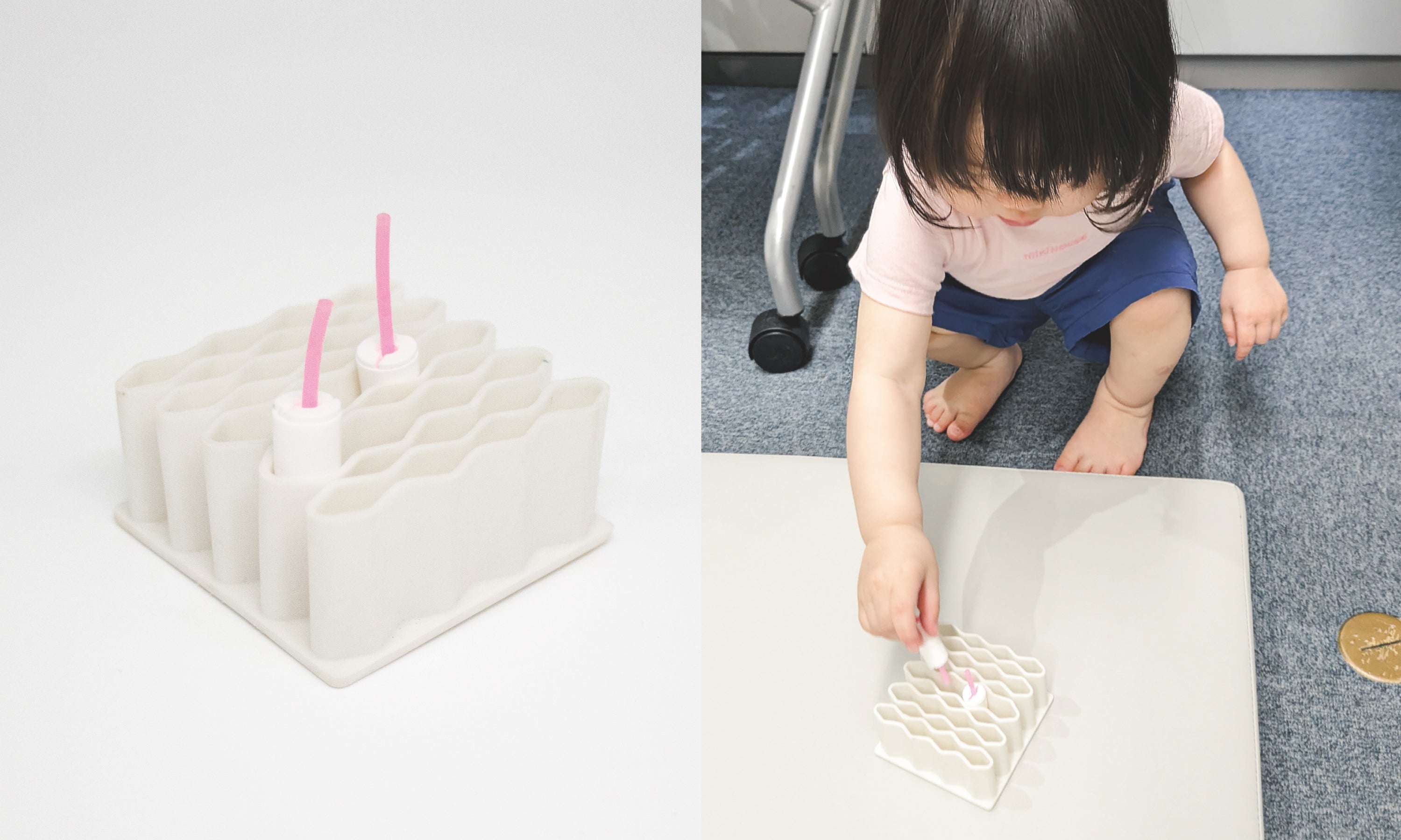 The first iteration recreated these elements using a simple combination of a rubber container with small gaps and pins. Children eagerly picked up and pulled out the pins, over and over.